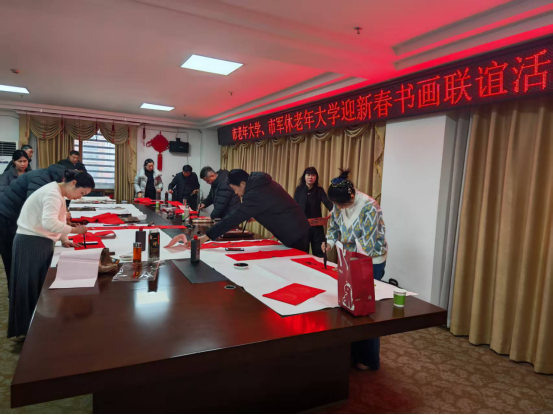 2月4日,市老年大学、市军休老年大学迎新春书画联谊活动在市军队离退休干部管理服务中心举行。军休老干部与书画艺术家们齐聚一堂,笔走龙蛇、挥毫泼墨,把对新年的美好愿景融进字里行间。一张张遒劲有力的“福”字、一对对饱含祝福的春联,传递的是党委政府对军休干部的崇高敬意和深切关怀。书画联谊活动不仅体现了市老年大学、市军休老年大学合作共建的丰硕成果,也充分展示了老同志们老有所学、老有所乐、老有所为的精神风貌。